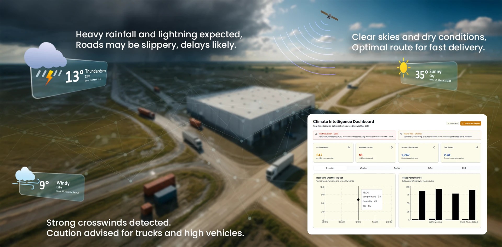 Modern logistics has to move forward from static route planning by integrating dynamic, real-time climate data layers to navigate urban complexities. The Federal Highway Administration (FHWA) reports that weather accounts for 23% of all roadway delays in the U.S., leading to more than 32 billion vehicle hours lost annually. A climate intelligence platform can generate real-time alerts and help optimize routes by weighing not only time and distance but also variable risk factors like weather and air quality.
